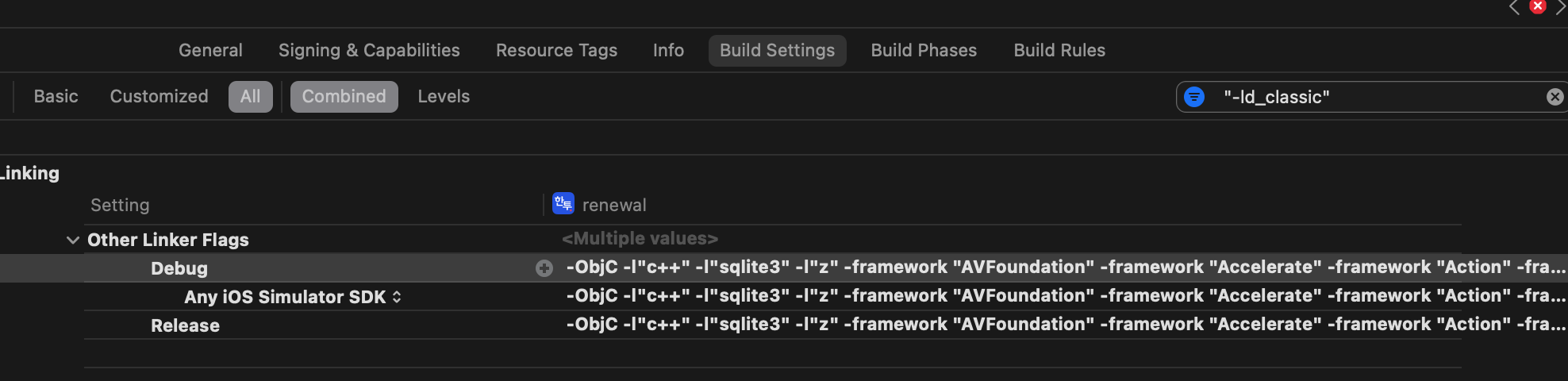 - 링크 옵션 제거: -ld_classic 링크 옵션을 제거하십시오. 빌드 스크립트 또는 프로젝트 설정에서 해당 옵션을 검색하여 제거하십시오.