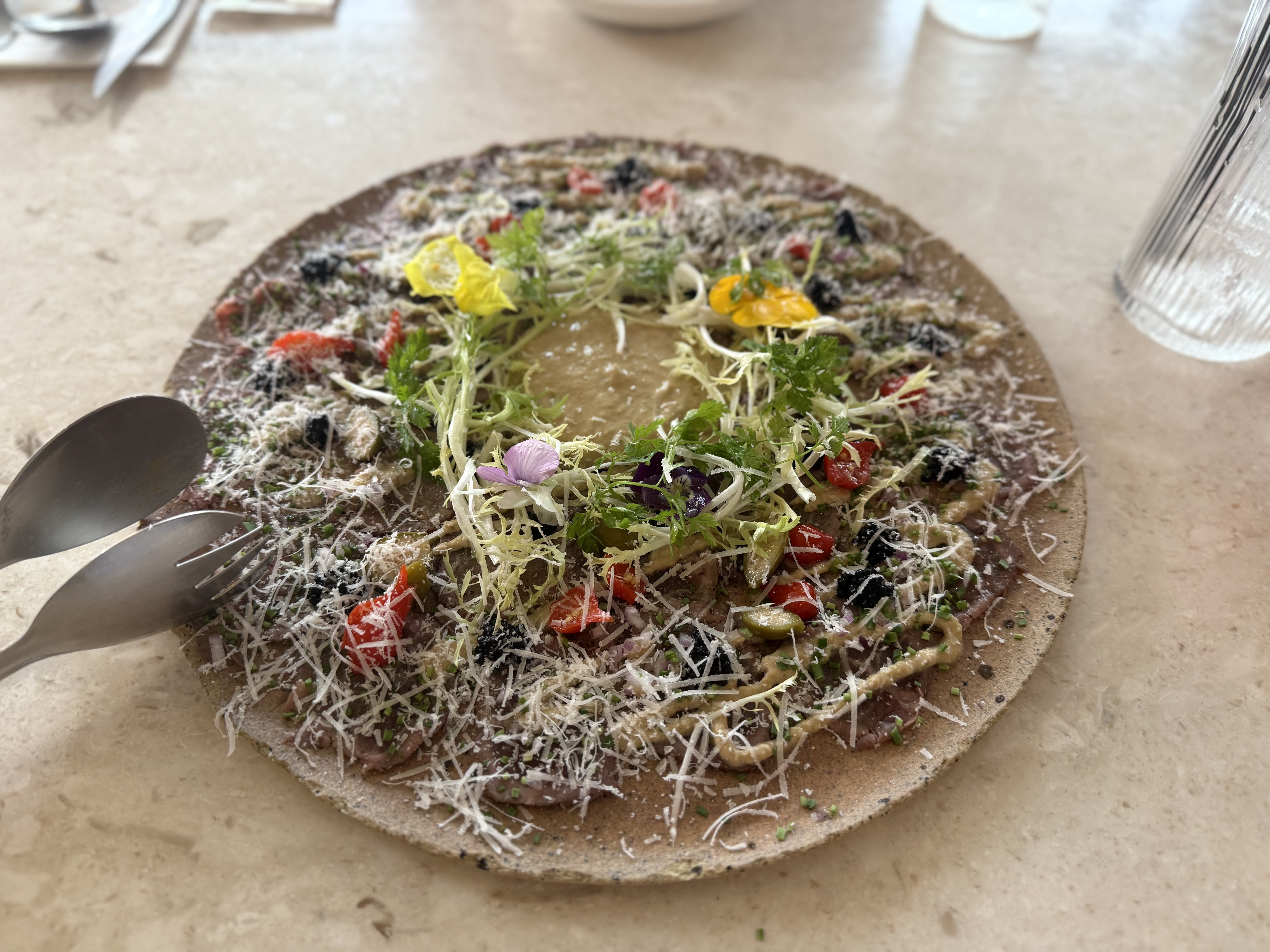 참치 소스가 베이스인 톤나토 소스 위에 신선한 허브와 에디블 플라워가 화려하게 장식되어 있어 마치 한 폭의 그림 같았어요. 파르미지아노 치즈가 가득 뿌려져 있어 고소함도 더했습니다. 면은 쫄깃하고 소스와의 조화가 정말 완벽했어요!