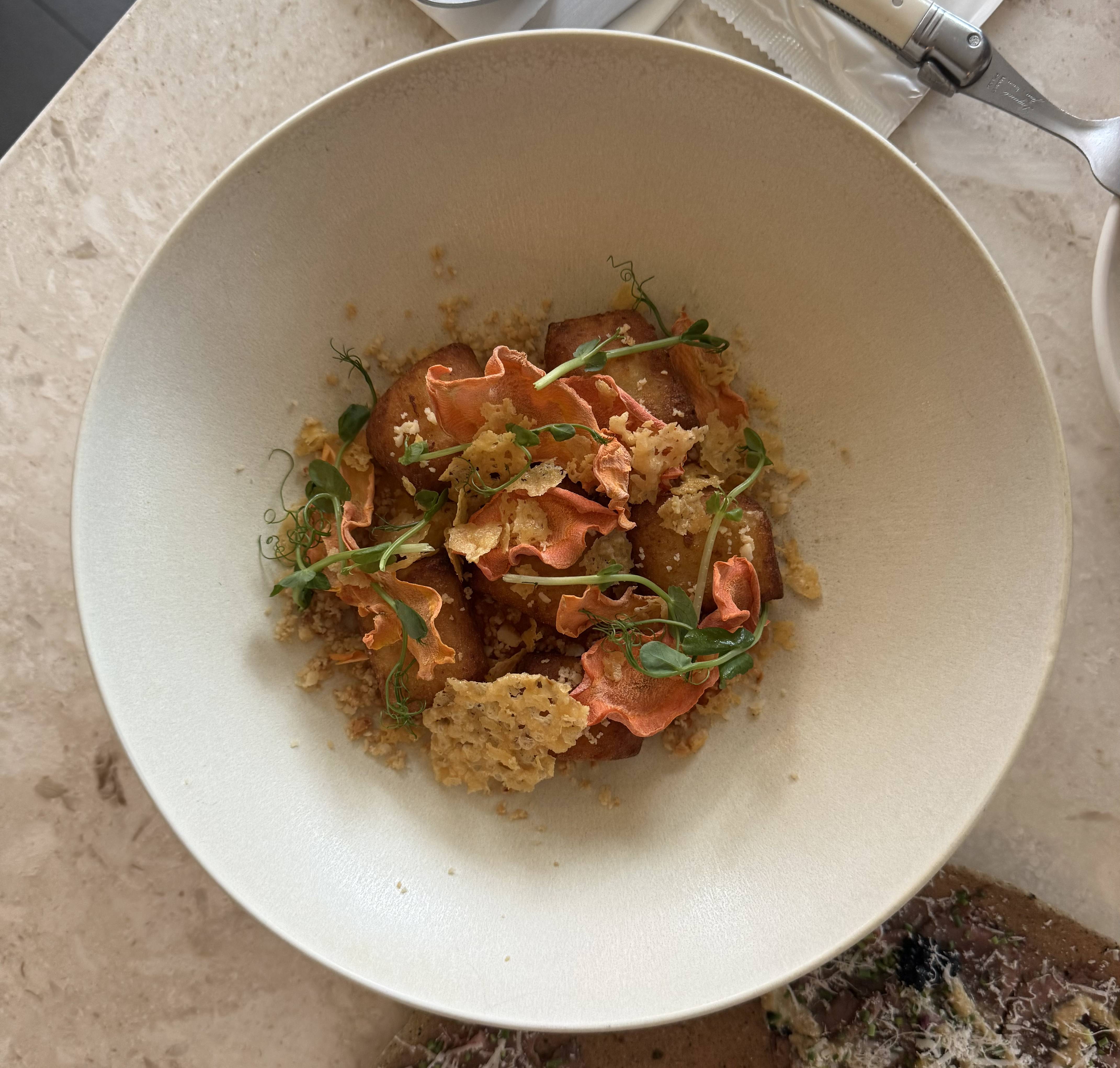 두 번째 메뉴인 감자뇨끼는 당근 소스로 만들어진 특별한 요리였어요. 뇨끼 위에 얇게 썬 생햄이 올려져 있고, 루콜라와 치즈 크리스프가 토핑으로 들어가 있었습니다. 당근 소스의 달콤함과 생햄의 짭조름함이 조화롭게 어우러져 정말 맛있었어요.