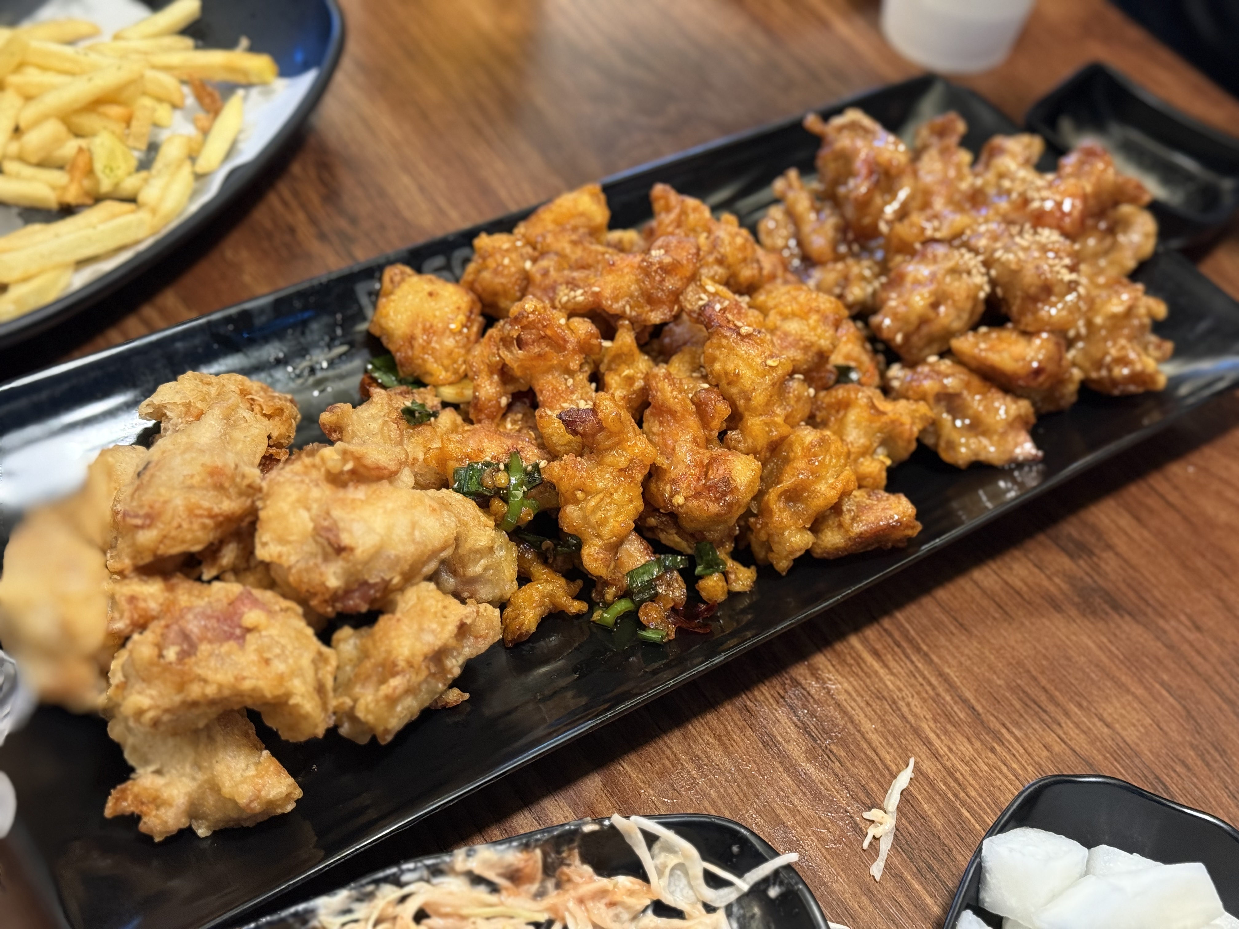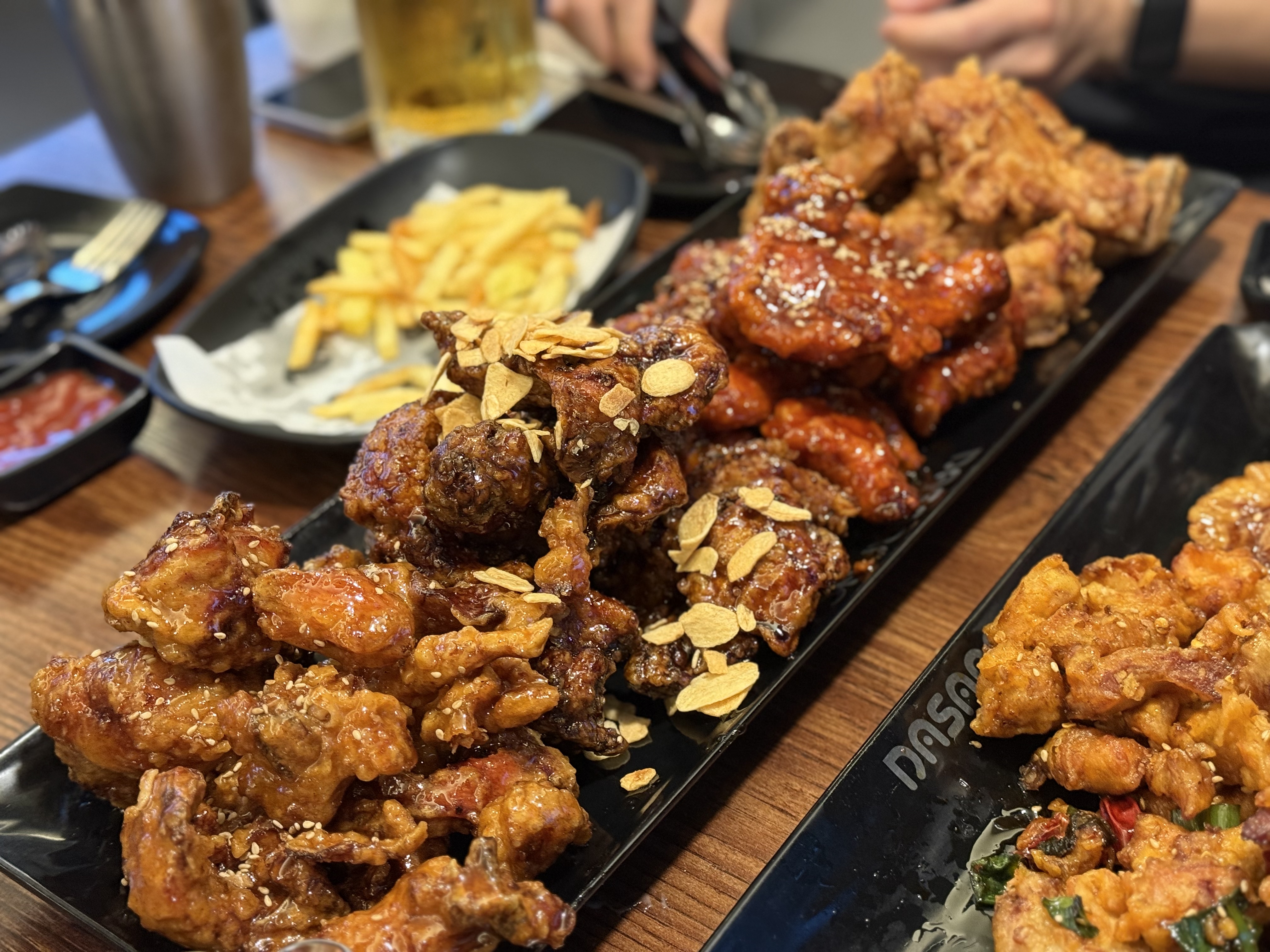 치킨 여러 가지 맛을 선택할 수 있는데 우리는 몇 가지 맛으로 주문함. "화살"이라는 맛을 시켰는데 이거 진짜 엄청 매웠음 🔥 매운 거 좋아하는 사람한테는 추천하지만 못 먹는 사람은 피하는 게 좋을 듯.