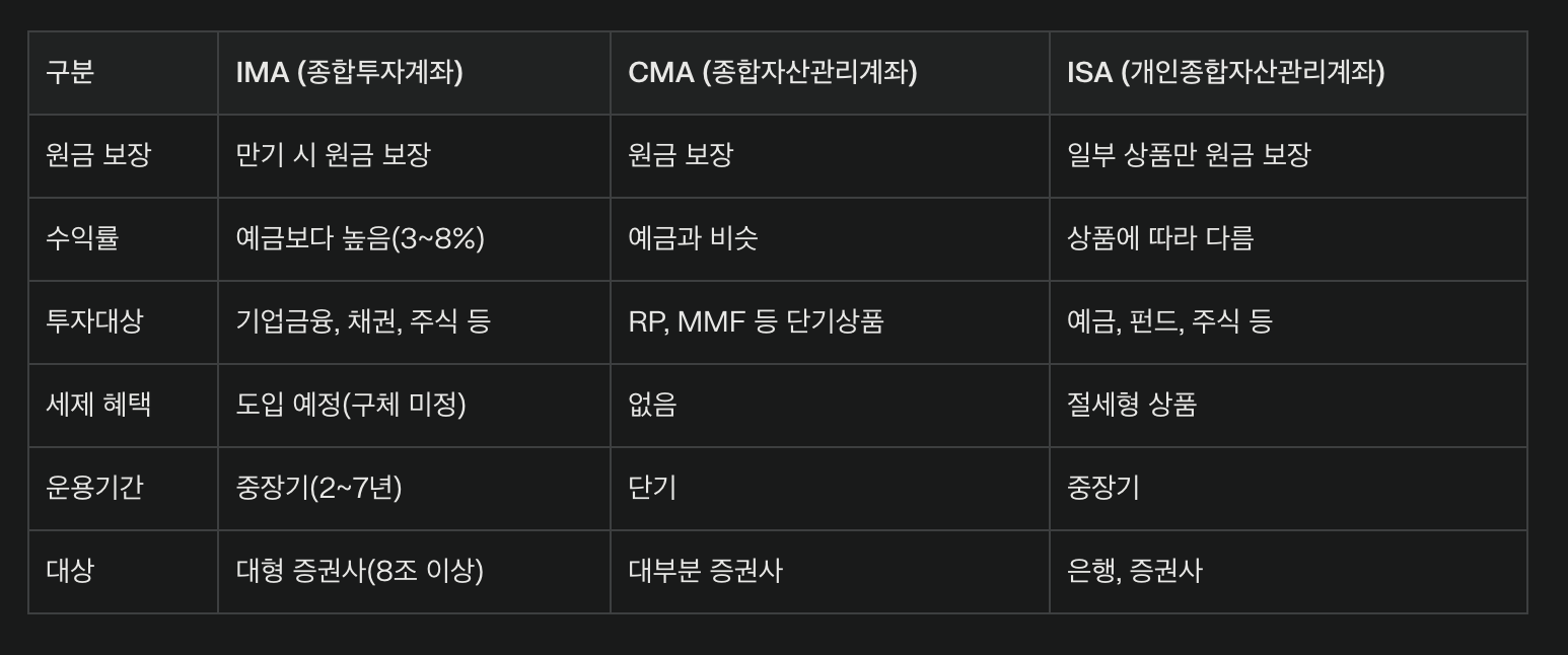 **IMA(종합투자계좌)**를 한마디로 설명하면, **"은행 예금보다 이자를 더 많이 주는 새로운 통장"**이라고 생각하시면 됩니다.