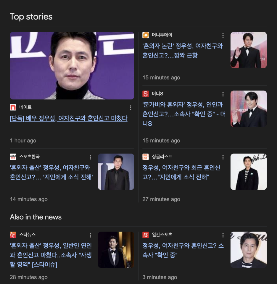 사실상 혼인신고가 사실로 확인된다면 정우성의 삶에 큰 변화임은 분명합니다. “과연 진짜일까?” “연인과의 인연이 결실을 맺는 건가?” 등 설레는 추측도 이어집니다. 평소 책임감이 강하고 진중한 이미지를 보여줬던 그이기에, 이번 소문을 팬들 역시 반갑게 보고 기다리는 분위기입니다.