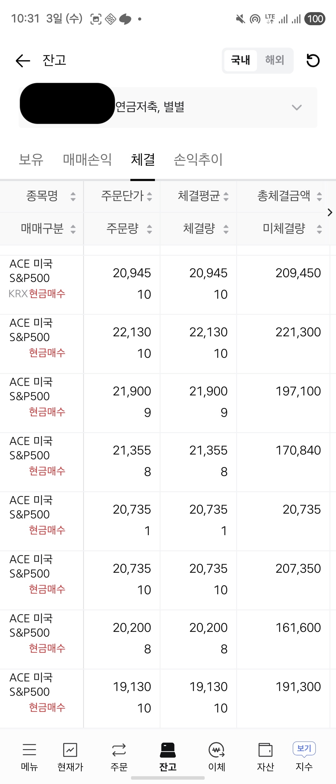 저는 회사에서 매달 약 18~20만 원 정도를 연금저축계좌에 납입해주고 있어서, 이를 활용해 ACE 미국 S&P500 ETF를 꾸준히 적립 매수해왔습니다. 벌써 3년 8개월이 지났고, 매달 체결된 내역은 아래와 같습니다.