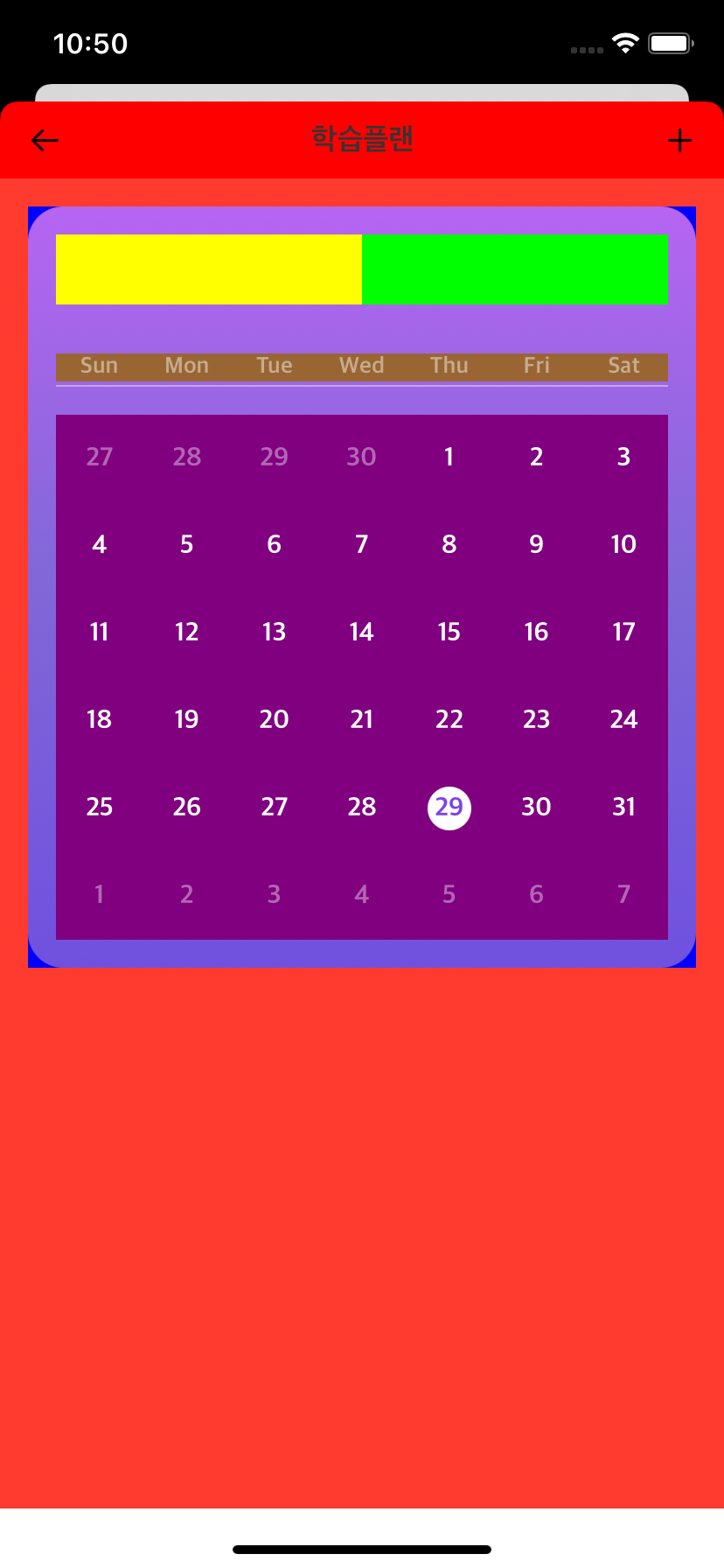 scrollView - systemRed 이고 스크롤뷰안에 있는 뷰가 viewInScroll 이고 viewInScroll 안에 버튼과 달력 UI가 있다.